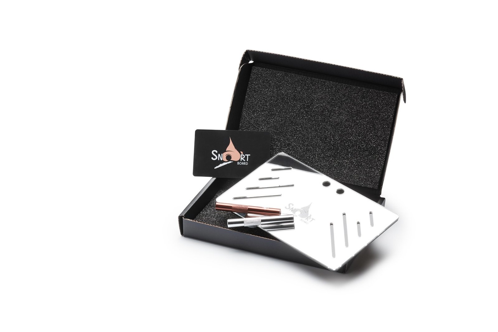 The snuff board has a length of 17.5 centimetres, a width of 10.5 centimetres and a thickness of only 0.5 centimetres. Moreover, its weight is only 95 grams, making this snuff board easy to carry for a line on the go. Included with this board are two snuff tubes and a line card.